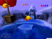 You're on ice skates here, and the first thing you'll notice is that you can't butt-bounce. You'll have to open crates with flip kicks which is a little harder to do. Practice it on the nearby crate. Also note that you cannot rev roll here. Carefully go down the hill and get used to the skates. Go slow at first so that you don't miss anything. If you pass things you can go back and get them but there's a limit to how far you can go backwards. If you miss anything swing back around as soon as you can to get get it. Don't make sudden movements if you want to go right through everything the first pass. Gently move the analog the slightest bit to turn. After a little while you'll reach the checkpoint. The next section is very hard to collect everything on. Once you reach the ramp you'll have to be going just right to eat all the pac dots. If you miss one down here it is possible to make your way back up the hill a little ways but it's not easy. You'll have to spin back up the hill and veer over to the right side (left if you're facing uphill) Pac-Man can climb slowly back up along the side. Then swing back over when you get high enough and sometimes you can get dots you missed. On the ramp, you'll want to jump off the top and flip kick to get the box. Keep going and there'll be another ramp. This one you won't be able to get the box unless you speed into it, but that makes getting the pac dots harder. You'll have to though, and later on it gets worse. Speed up into the jump by pressing forward. You'll notice that there is a path to the left and a treasure box on top of a cliff next to this jump. There is a token in the treasure box and a crate with a token on the path. I suggest you go back for them later. It's almost impossible to get all the tokens and the pac dots/fruit on the same run. Just keep going. The next gap you need good speed for as well. The boxes over the next two contain a 1-Up and a token, so you do not need them to get the bonus token. On the last gap with the token, you can go slow into the jump and land on the ice island if you want to play it safe. Remember the bonus token is for getting all the pac dots and fruit. You can come back and collect all the tokens later with no penalty. After this you'll come to a cave. This is like the first cave and you should now find it extremely easy compared to the last section. The next step is similar. There is a huge slide at the end of the level, jump well to collect the Token, and if you jump towards the end of the stage a chest with galaxian maze will appear, then the end of the stage.