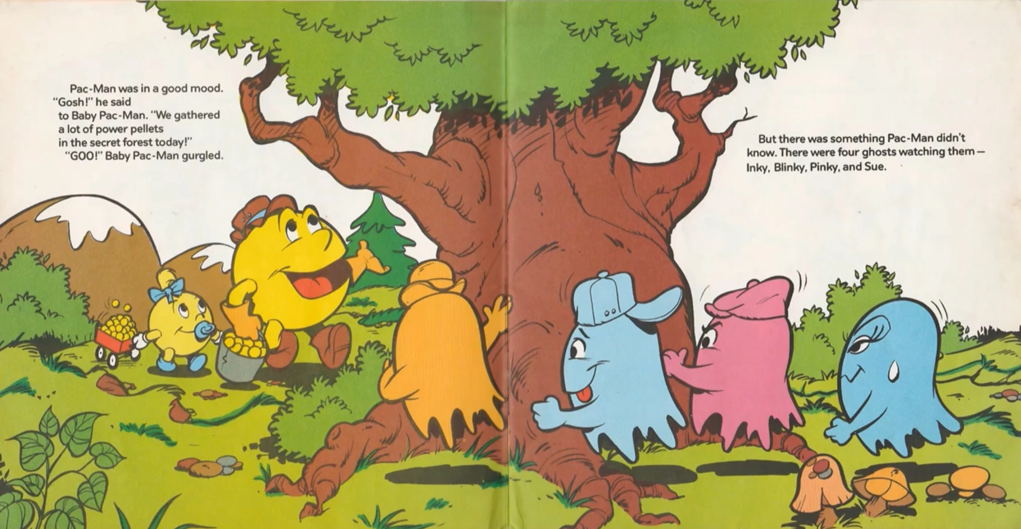 In a stranger case of this error, Clyde is entirely gone from the books Pac-Man and the Ghost Diggers and Ms. Pac-Man's Prize Pupil, with Inky taking his role while Blinky replaces Inky (and is colored red on both covers despite being cyan in the books themselves) with Pinky and Sue remaining the same as they are with their Hanna-Barbera counterparts.