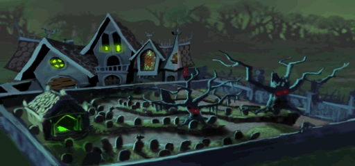 Ghost Mansion is a level in Pac-Man World Rally. It is the final level in the Cherry Cup.The track has a Haunted Mansion, a Graveyard, Zombies, a Spider, Frankenstein, Dracula, and a Stained Glass Window