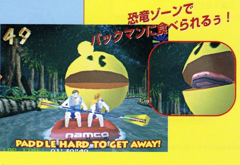 - In the Autumn Valley level, bumping into a rock will cause it to rotate. If the player rotates rocks 3 times, the player will be chased by a giant Pac-Man in the Dinosaur Zone, who will eat the raft if they do not get away in time.