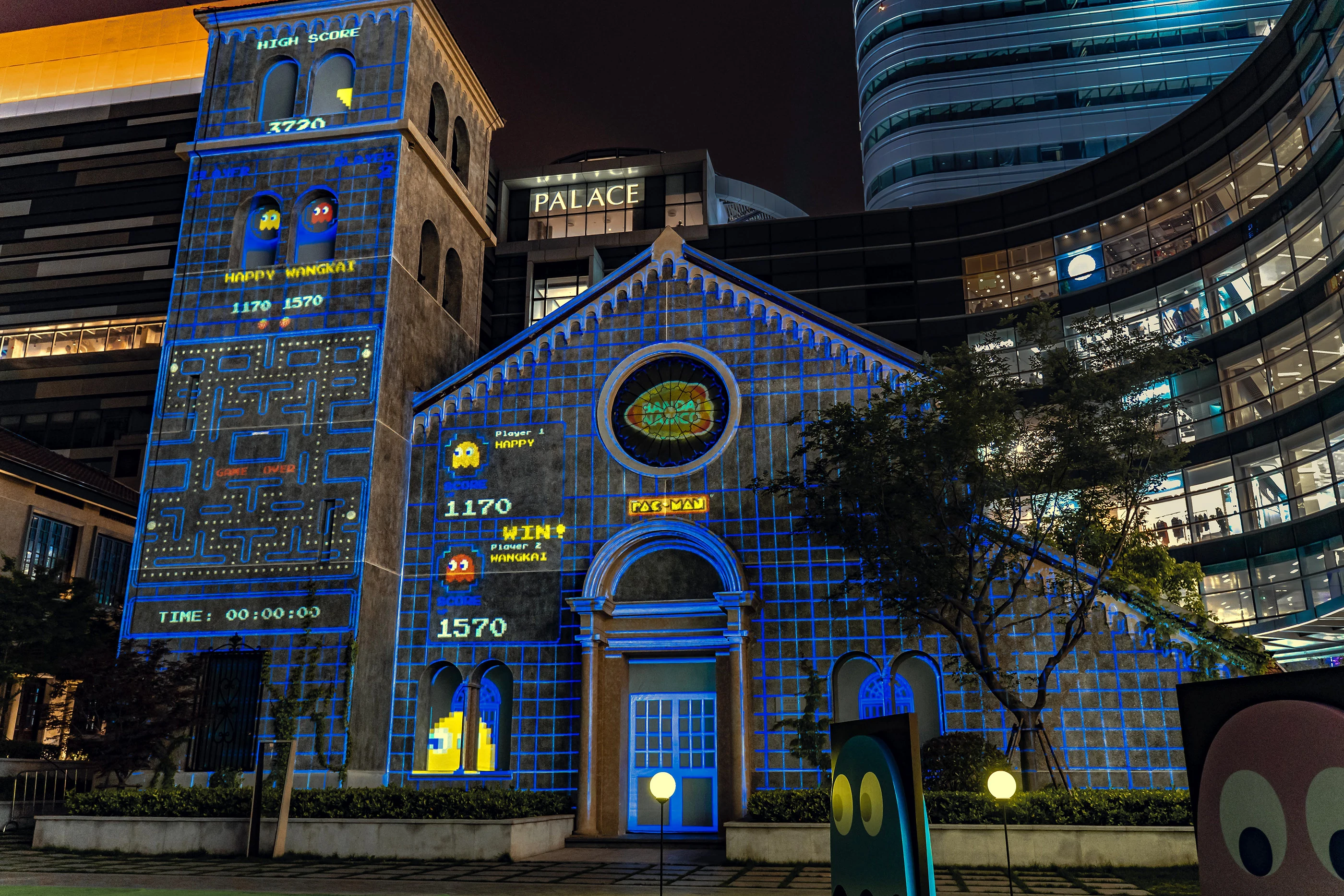 Pac-Man Interactive Projection (吃豆人 建筑投影互动游戏) refers to an event held in Raffles City, Shanghai in 2019, where a playable Pac-Man game was projected onto a giant building. The software was developed by Studio NOWHERE under license from Bandai Namco China.