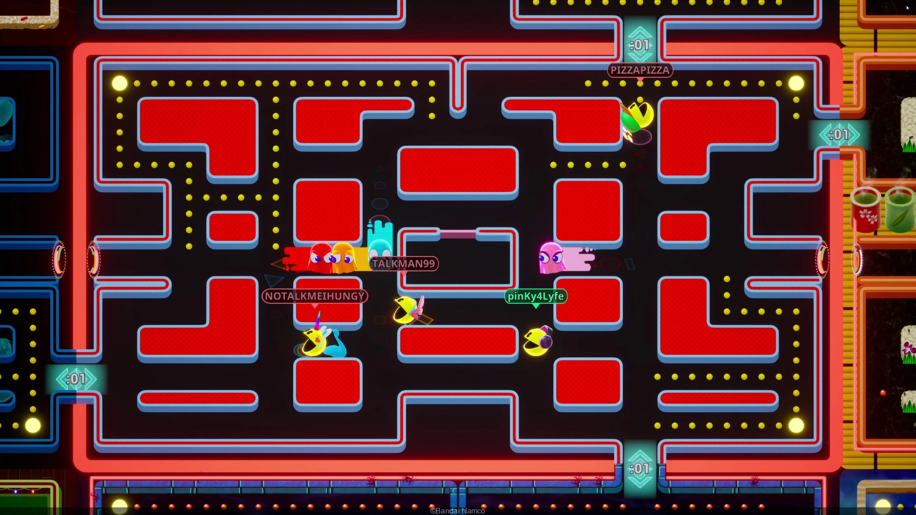 Pac-Man can eat Power Pellets to eat other Pac-Man players, a mechanic which was previously seen in Pac-Man Battle Royale.